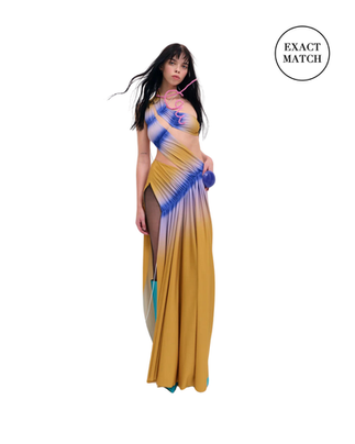 Ariana SLAYED this asymmetrical ruched dress from polish brand FAL-ASH during the Mr & Mrs Challenge. While this dress is truly one of a kind, we found a few vacation-ready styles that harness similar colorful vibes: a tropical jersey maxi dress from Club L London ($105) and a beachy tie-dye slip dress from Young, Fabulous & Broke (available at Revolve).
